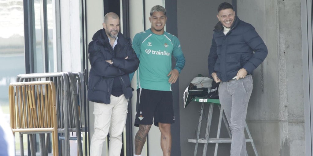 El colombiano, lesionado, dialoga con el consejero y director deportivo durante el entrenamiento...