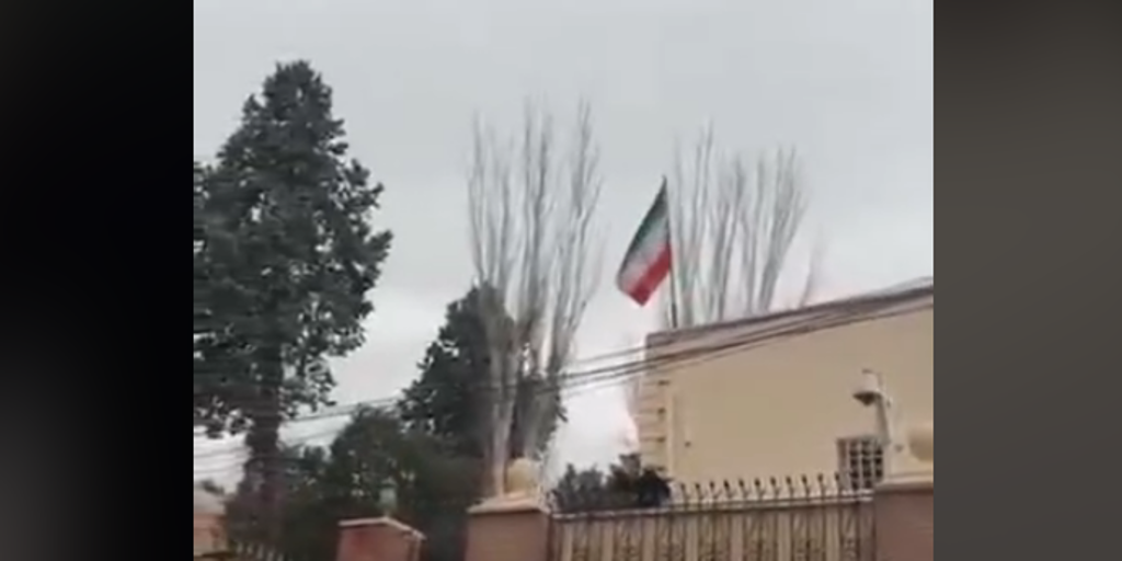 Un activista cambia la bandera de la Embajada de Irán en Madrid por la anterior a la revolución de 1979