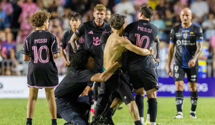 تعرض نجم كرة القدم الأرجنتيني ليونيل ميسي للدفع أرضًا من قبل أحد المشجعين وحارس أمن في نهاية مباراة إنتر ميامي الودية في بورتوريكو. كان إنتر ميامي يلعب ضد إنديبندينتي ديل فالي الإكوادوري في بايامون أمس الخميس، عندما ركض أحد المشجعين إلى منتصف الملعب وأمسك ميسي من خصره، قبل أن يقوم حارس أمن بإسقاطهم...