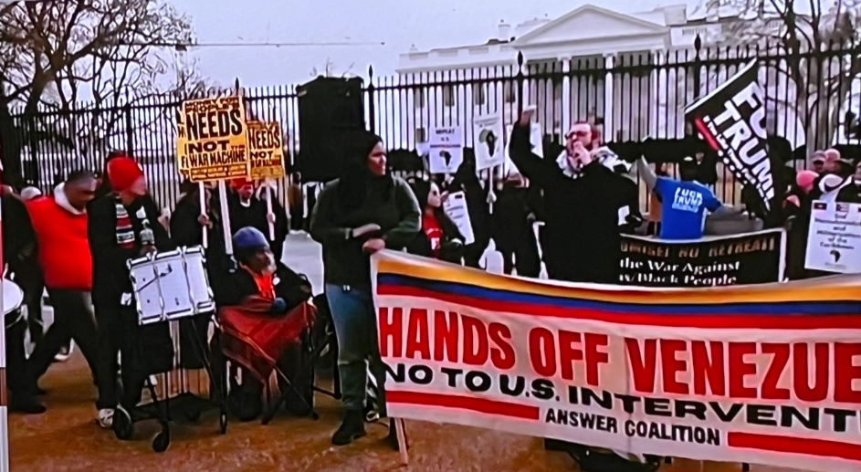 شهد البيت الأبيض، منذ قليل، عدة تجمعات تنديدًا باعتقال رئيس فنزويلا نيكولاس مادورو وزوجته سيليا فلوريس والعملية العسكرية التي نفّذتها الولايات المتحدة الأمريكية في فنزويلا فجر اليوم السبت. وخرج المتظاهرون يهتفون ضد العملية العسكرية في فنزويلا مطالبين بالإفراج عن الرئيس نيكولاس مادورو، حيث شهدت المن...