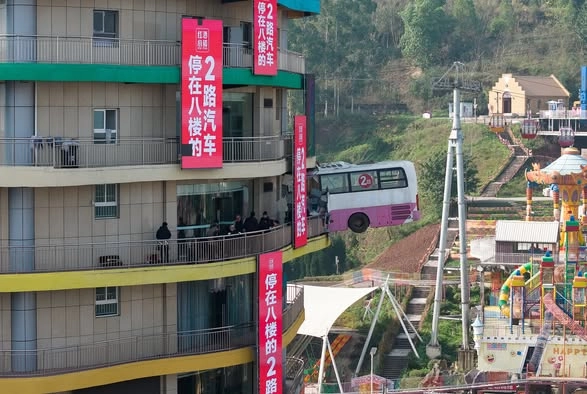 حافلة تخترق مبنى.. "وهم بصري" يتحول إلى معلم سياحي في الصين
