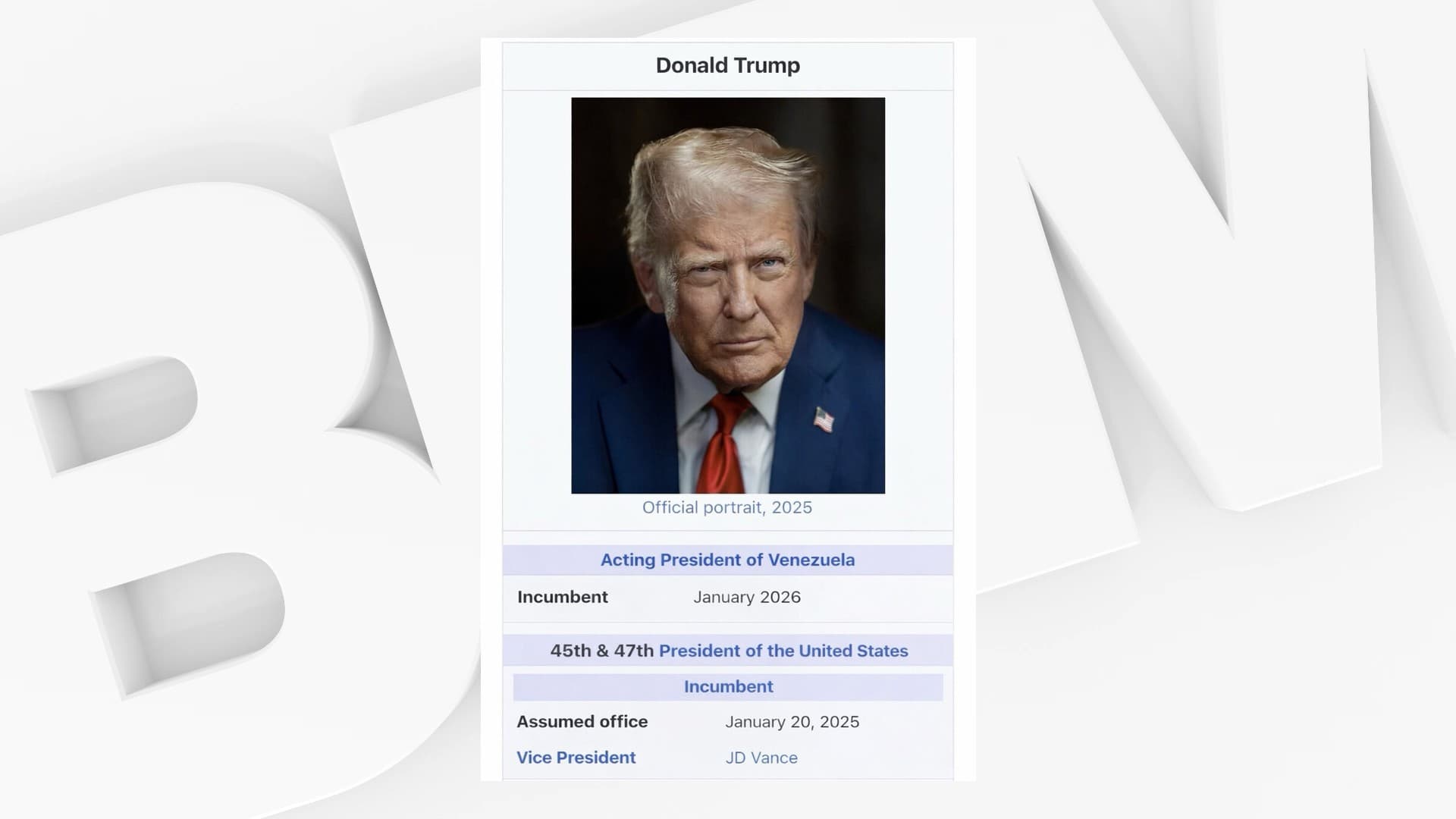 "Président du Venezuela": Donald Trump relaie sur son réseau social un montage d'une fausse page Wikipédia 12 janv. 2026, 22:24 ... Redirecting to full article...
