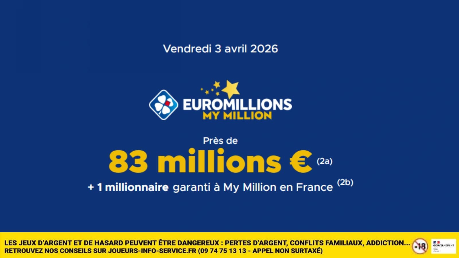 Tirage EuroMillions : la FDJ met en jeu un jackpot de 83 millions d'euros ce vendredi 3 avril 2 avr. 2026, 18:09 ... Redirecting to full article...