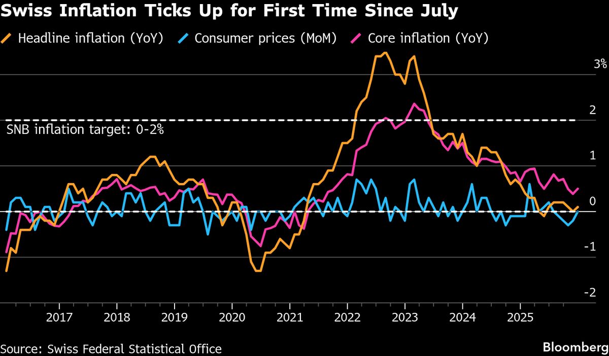 Swiss inflation ticked up last month for the first time since July, easing pressure on the Swiss National Bank to reintroduce negative interest rates....