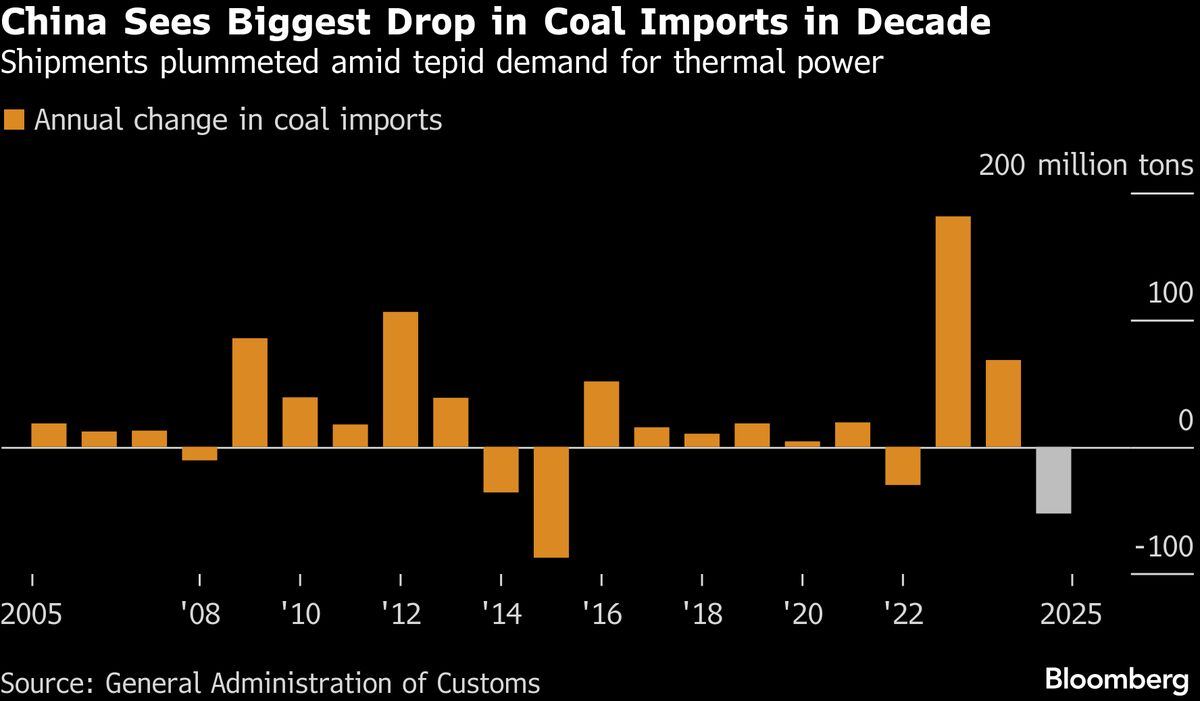 China’s coal purchases fell the most in a decade last year, posting the steepest drop among imports of major commodities due to an abundance of cheaper alternatives and a rare contraction in thermal power generation....