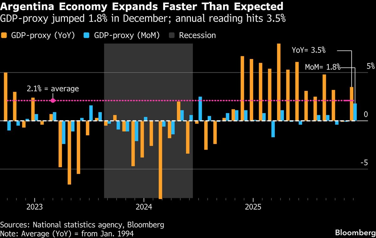 Argentina’s economy grew more than expected in December due in part to a historic wheat harvest and overcoming the fallout from a pivotal midterm election that set off a sharp market selloff....