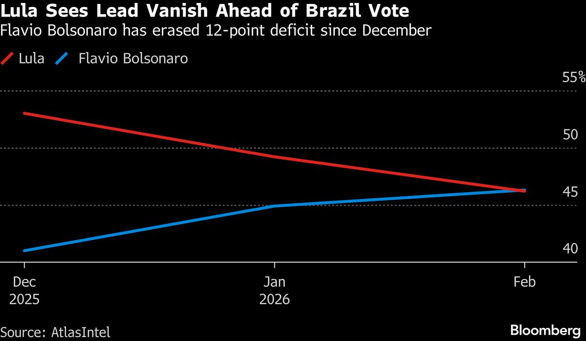 President Luiz Inacio Lula da Silva and Flavio Bolsonaro are deadlocked ahead of Brazil’s October presidential election, according to a new poll that shows the race tied for the first time....