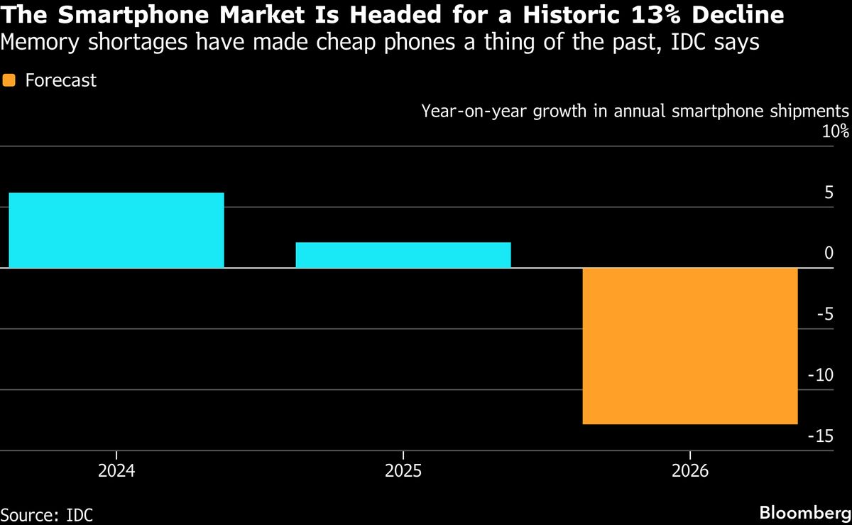 The global smartphone market will contract 12.9% in 2026 because of the unprecedented memory chip shortage, marking “a crisis like no other,” according to researcher IDC....