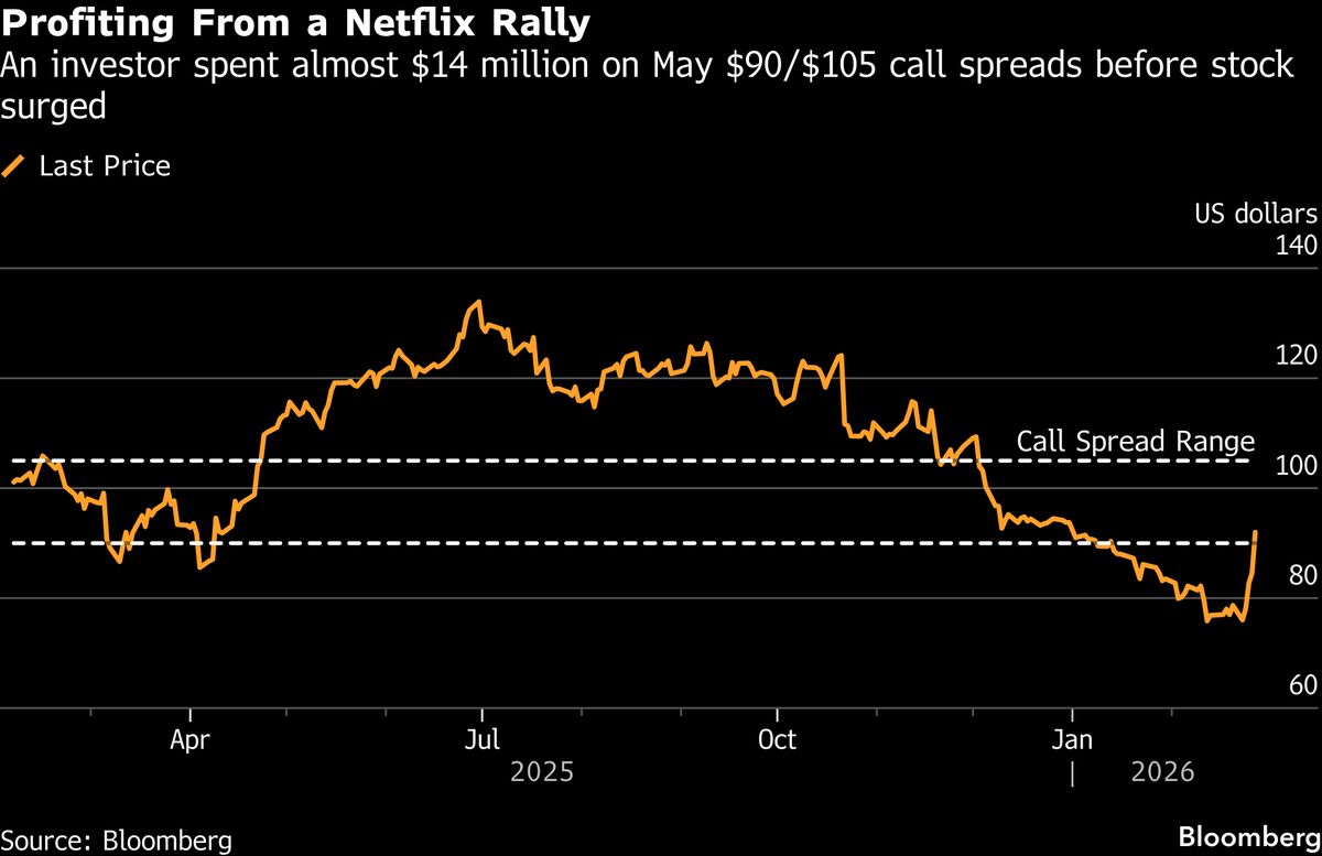 An options trader who bet big on a Netflix Inc. rally is sitting on a roughly $16 million paper gain as shares soared after the streaming giant pulled its bid for Warner Bros. Discovery Inc....