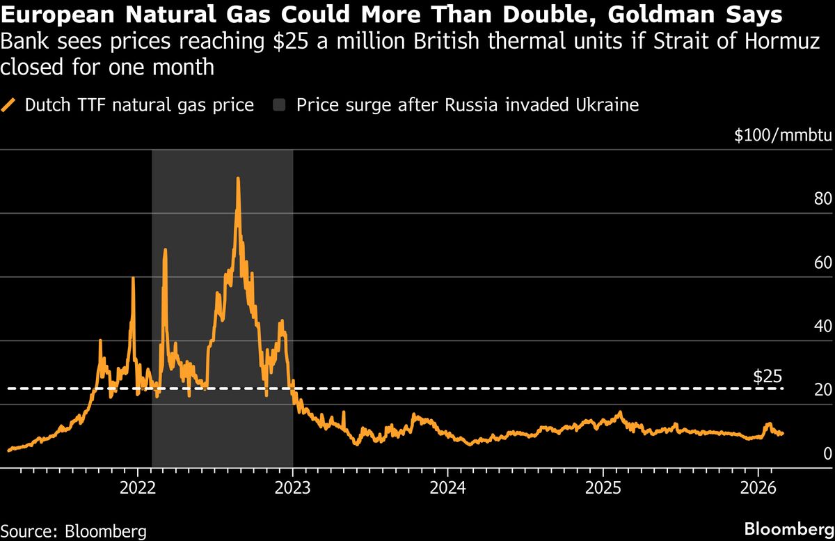 European natural gas prices could more than double if shipping through the Strait of Hormuz is halted for one month, according to Goldman Sachs Group Inc....