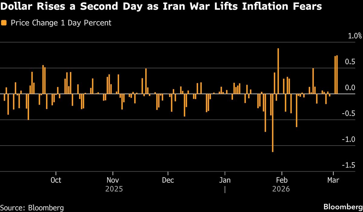 The dollar headed for its biggest two-day rally in almost a year as the deepening war in Iran stoked inflation fears and spurred demand for havens....