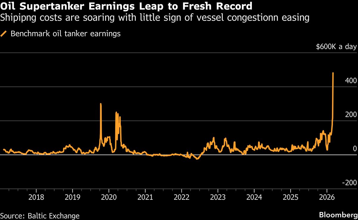 The cost of booking the world’s biggest oil tankers on the industry’s benchmark route hit a fresh record as shipping traffic through the Strait of Hormuz remains all-but halted....