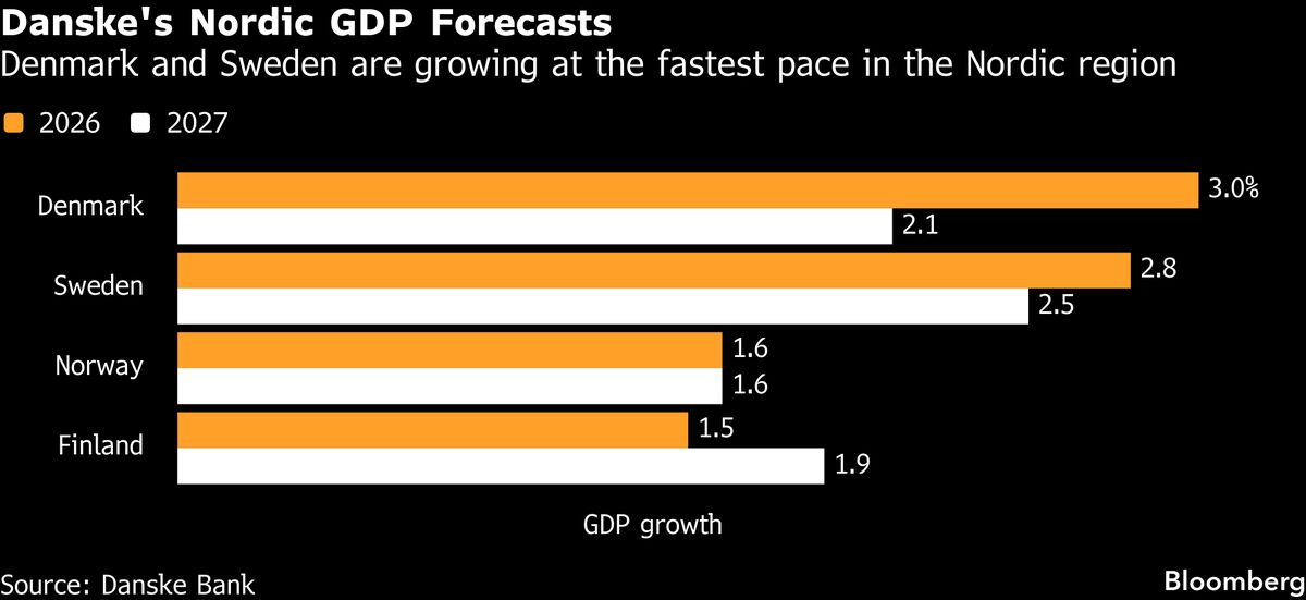 Denmark’s economy is poised to expand at the fastest pace in the Nordic region this year, even as pharmaceutical giant Novo Nordisk A/S grapples with slowing sales, according to the country’s largest lender....