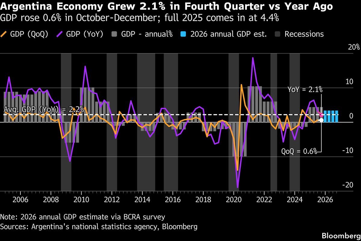 Argentina’s economy expanded less than analysts anticipated at the end of 2025, marking a slowdown even as President Javier Milei tries to stimulate growth....