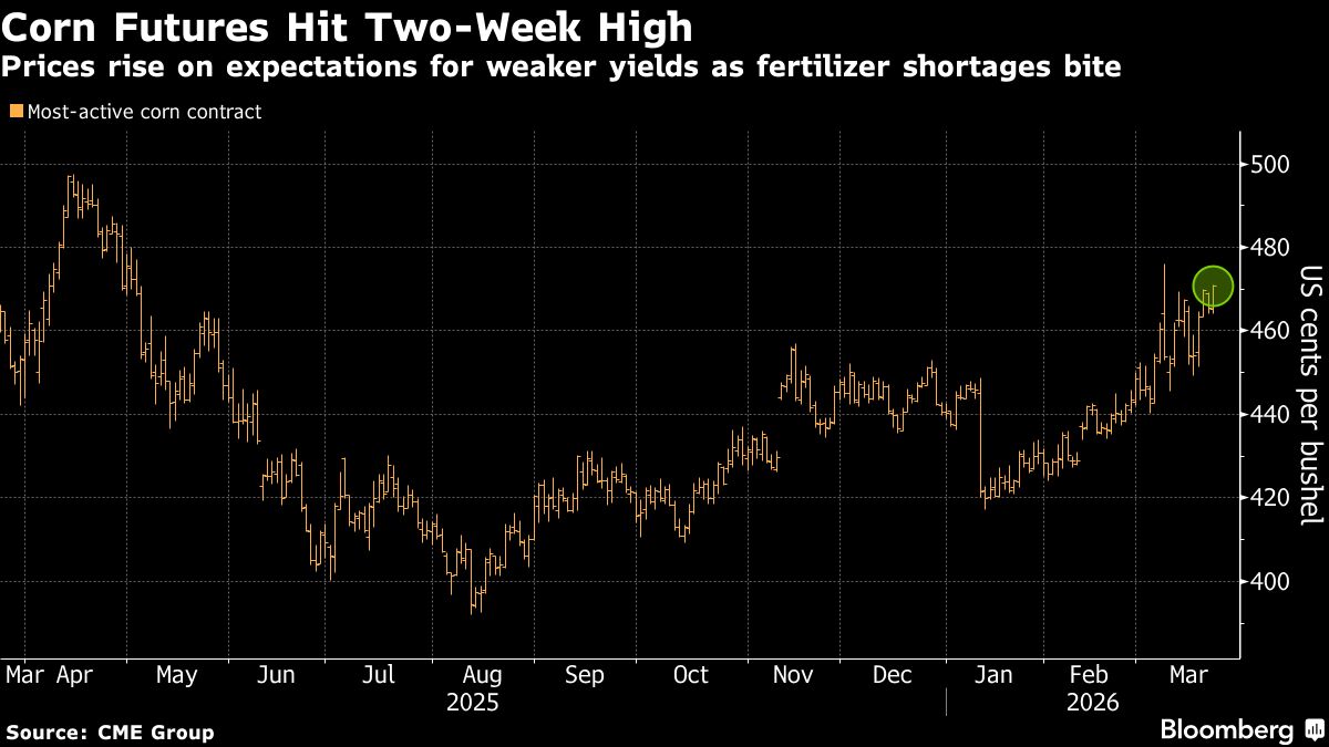Corn futures rose to a two-week high as disrupted fertilizer supplies from the effective closure of the Strait of Hormuz casts doubts over the size of the upcoming US crop....
