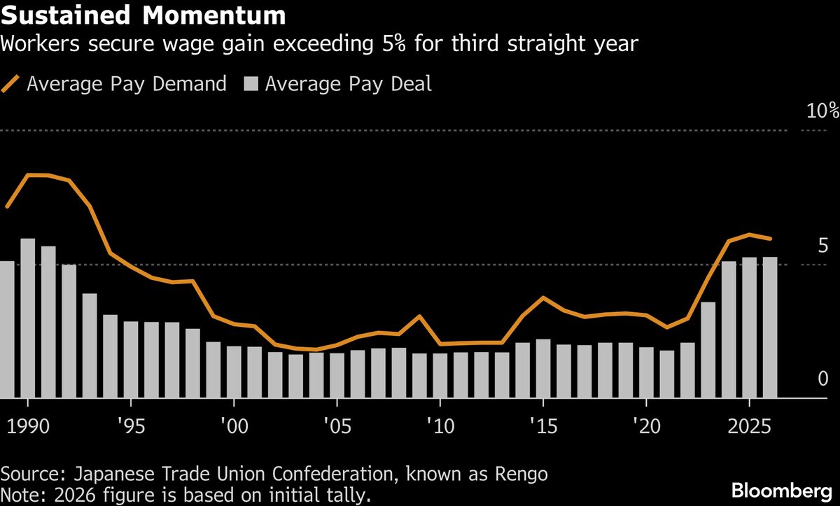Japan’s Key Labor Union Wins Wage Hike Topping 5% for Third Year
