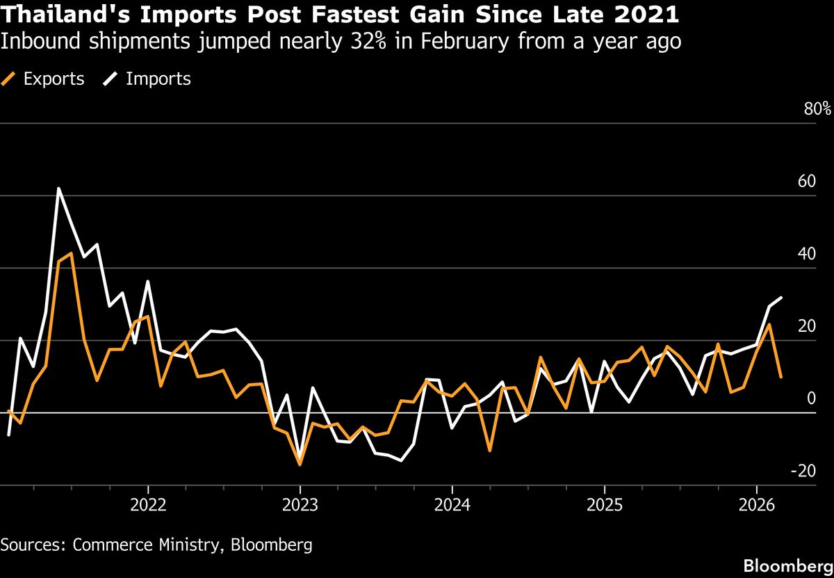 Thailand’s inbound shipments soared while exports growth slowed, even before the conflict in the Middle East began disrupting global trade and raising costs....