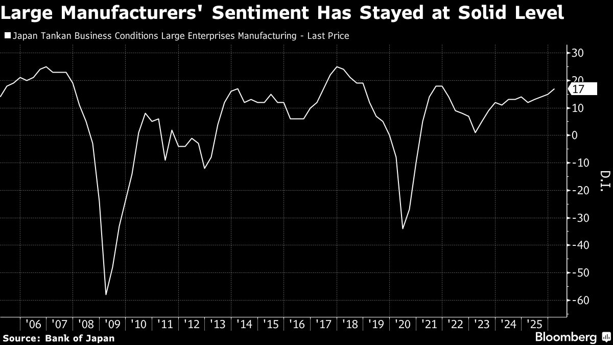 Japan’s large manufacturers showed greater confidence in the state of business conditions for a fourth straight quarter even as the Middle East crisis erupted, an outcome that supports the Bank of Japan’s policy stance of continuing to raise interest rates....