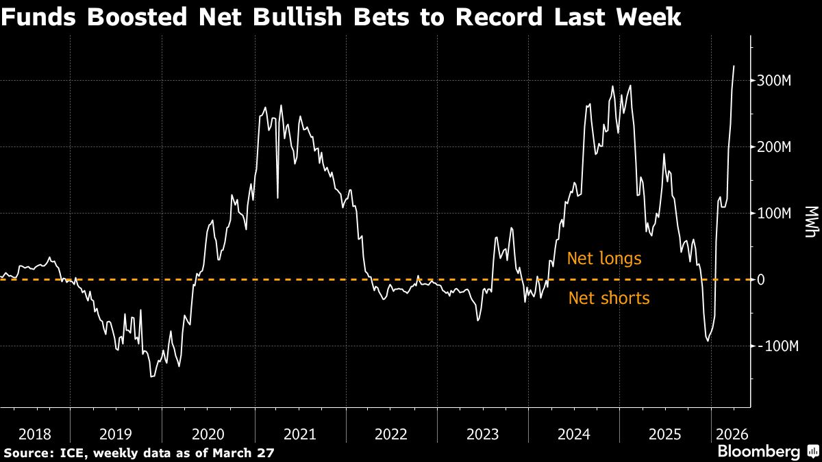 Funds and other speculators boosted their net long positions in European natural gas to a record high before this week’s selloff in energy markets....