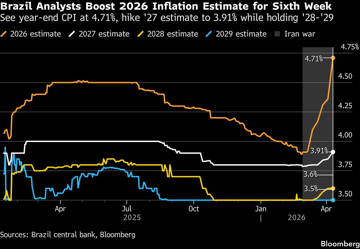 Brazil economists raised their 2026 inflation forecast above the central bank’s target ceiling, the latest fallout from the Iran war’s energy shock....