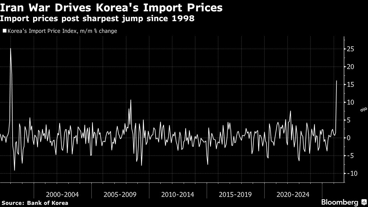 South Korea’s import prices posted their biggest surge in nearly three decades, underscoring the scale of cost pressures rippling through the economy as the Iran war spurs a spike in oil and weighs on the won....
