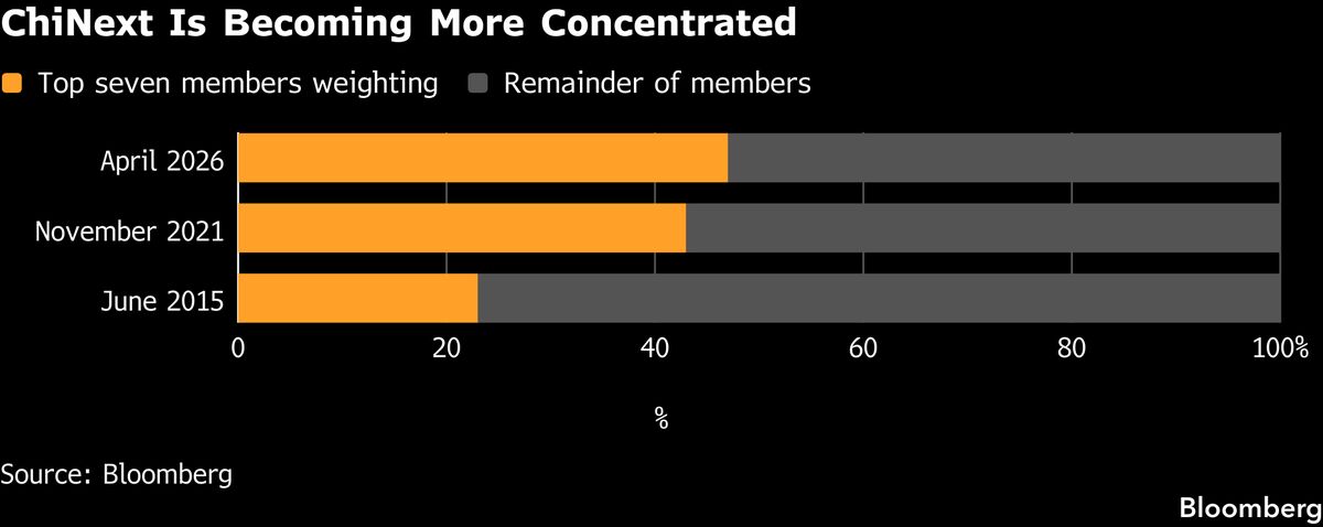 China’s tech-heavy ChiNext Index is becoming increasingly concentrated as it powers to an 11-year high, buoyed by earnings beats from a small group of heavyweight stocks....