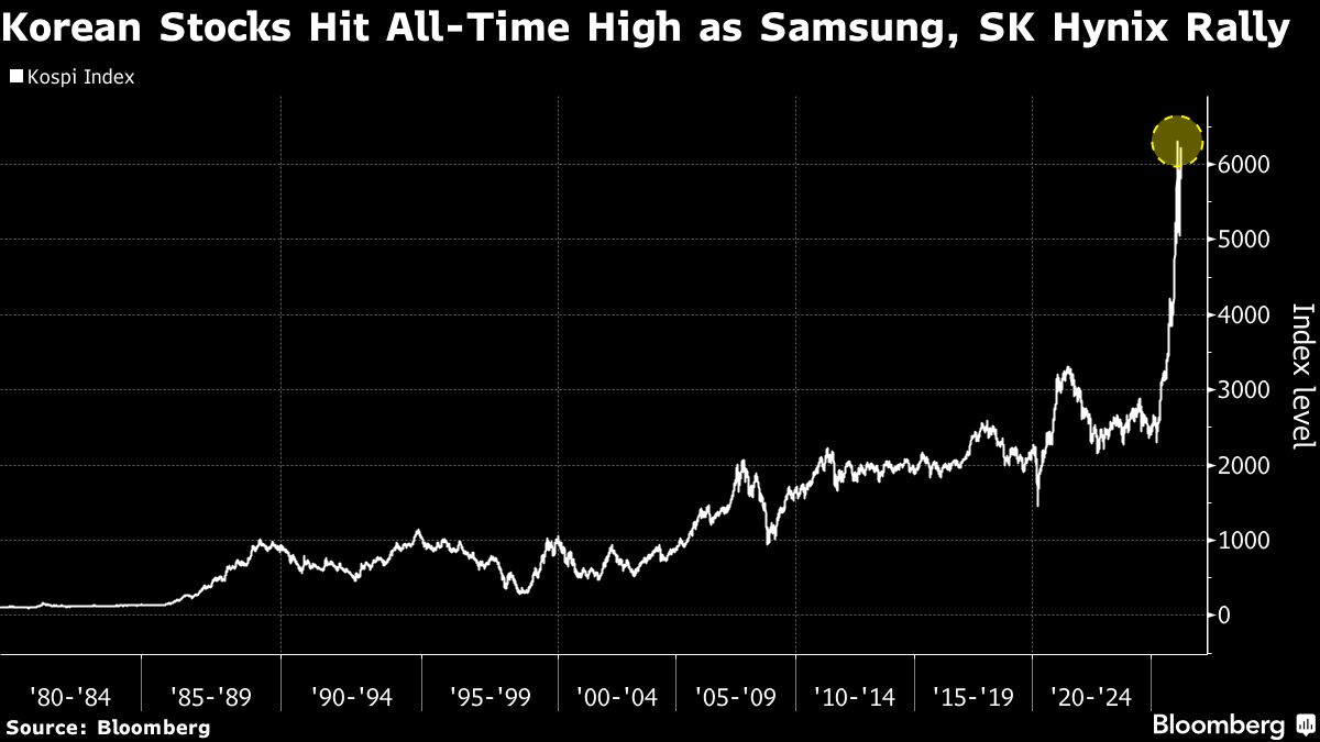 South Korean stocks climbed to a record, powered by chipmakers as the artificial intelligence trade regained momentum and optimism reemerged about a US-Iran peace deal....
