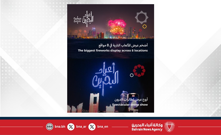 المنامة في 31 ديسمبر/ بنا / أعلنت هيئة البحرين للسياحة والمعارض عن برنامج احتفالي استثنائي في ختام موسم أعياد البحرين 2025، يتضمن عروض ألعاب نارية مبهرة إلى جانب أكبر عرض درون تشهده مملكة البحرين، والتي تنطلق عند الساعة 12:00 منتصف ليلة رأس السنة، بشكل متزامن في 8 مواقع استراتيجية تمتد عبر أبرز الوا...