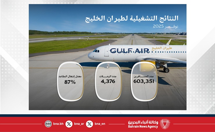المنامة في 31 ديسمبر/ بنا / سجّلت شركة طيران الخليج، الناقلة الوطنية لمملكة البحرين، أداءً تشغيليًا قويًا خلال شهر نوفمبر 2025، مدعومًا بالإقبال الكبير على السفر عبر شبكة وجهاتها المتنامية. فقد نقلت الشركة 603,351 مسافرًا، وسيّرت 4,376 رحلة، في حين وصل معدّل إشغال المقاعد إلى 87%، وهو ما يعكس قوة إ...