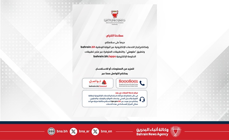 هيئة المعلومات والحكومة الإلكترونية تدعو المواطنين والمقيمين لاستخدام خدماتها عبر البوابة الوطنية Bahrain.bh وتطبيق حكومتي