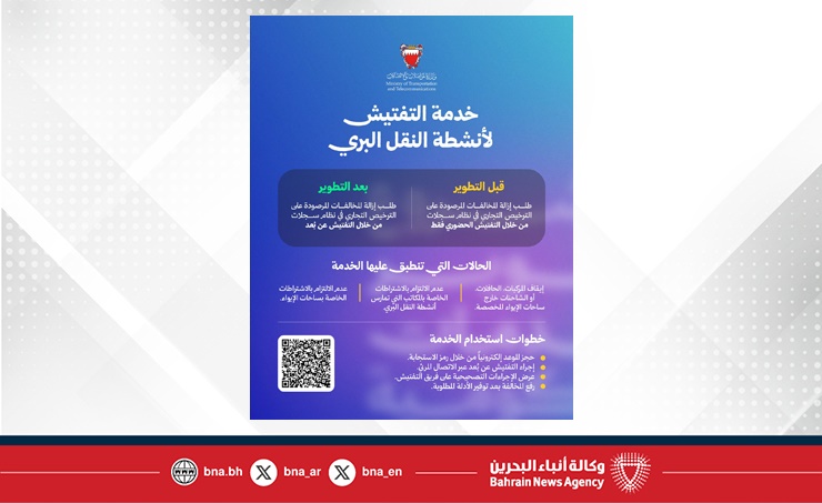 المنامة في 15 يناير/ بنا / في إطار الجهود الحكومية لتطوير جودة الخدمات وإعادة هندستها، دشّنت وزارة المواصلات والاتصالات خدمة التفتيش عن بُعد لقطاع النقل البري، كخدمة رقمية جديدة تهدف إلى تسريع إجراءات تصحيح المخالفات ورفع كفاءة العمليات الرقابية. وتُخصص خدمة التفتيش عن بُعد للمؤسسات الحاصلة على ترا...