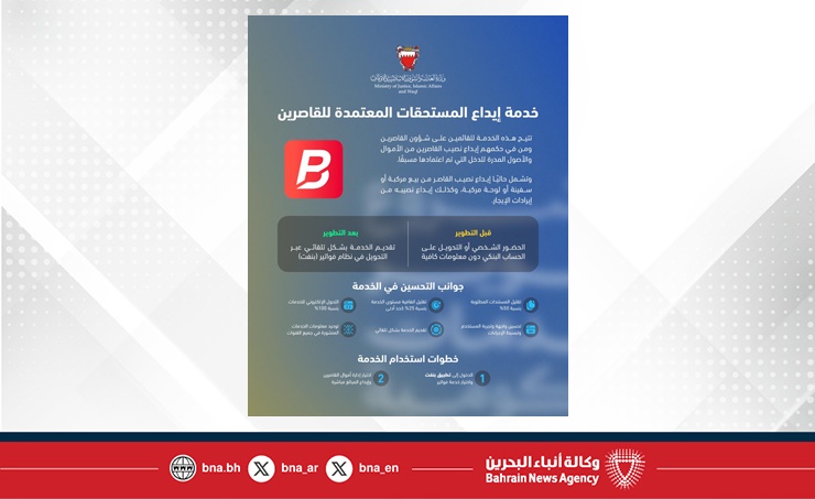 المنامة في 24 فبراير / بنا / في إطار الجهود الحكومية الرامية إلى تطوير جودة الخدمات وإعادة هندستها، أعلنت وزارة العدل والشؤون الإسلامية والأوقاف عن إطلاق خدمة إيداع المستحقات المعتمدة للقاصرين، وذلك بالتعاون مع شركة "بنفت" عبر نظام "فواتير". وأوضحت الوزارة أن خدمة إيداع المستحقات المعتمدة تتيح للقا...