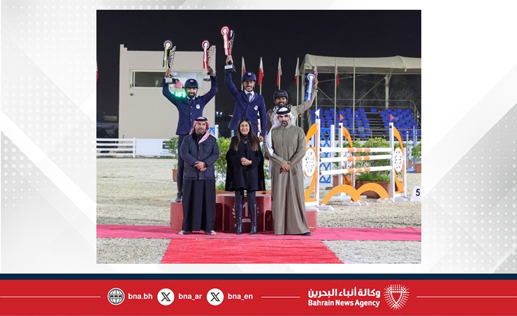 المنامة في 03 يناير/ بنا / توّج الشيخ عبدالله بن محمد آل خليفة رئيس لجنة قفز الحواجز بالاتحاد الملكي البحريني للفروسية وسباقات القدرة، فارس فريق وزارة الداخلية معيوف الرميحي مع جواده غياث بلقب بطولة الاتحاد الملكي البحريني للفروسية وسباقات القدرة لقفز الحواجز، والتي أقيمت منافساتها "الجمعة"، بميدان...