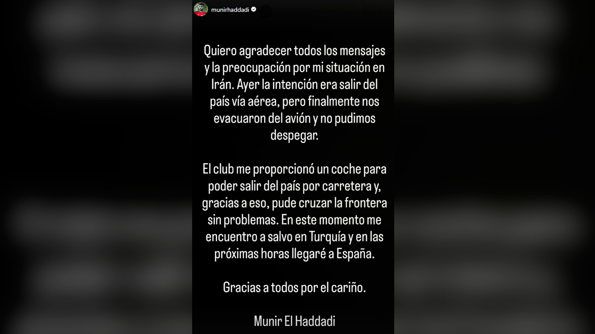 Munir El Haddadi consigue salir de Irán por carretera y comunica que se encuentra en Turquía a salvo