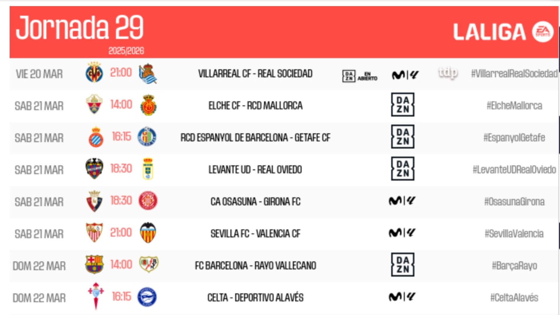 El fin de semana comenzará el viernes 20 con el Villarreal-Real Sociedad y acabará con el duelo madrileño, que se jugará horas después del Barça-Rayo...