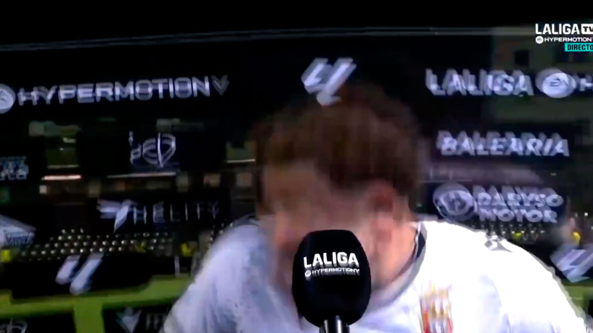 El susto que se lleva un jugador del Ceuta durante la entrevista tras el partido ante el Deportivo