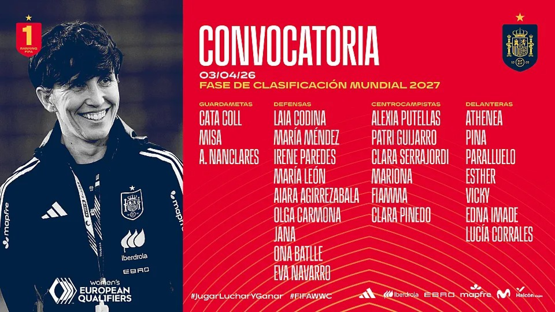 Cata Coll, Irene Paredes, Mapi León y Esther González vuelven a la lista para los partidos ante Inglaterra y Ucrania, clasificatorios para el Mundial 2027....