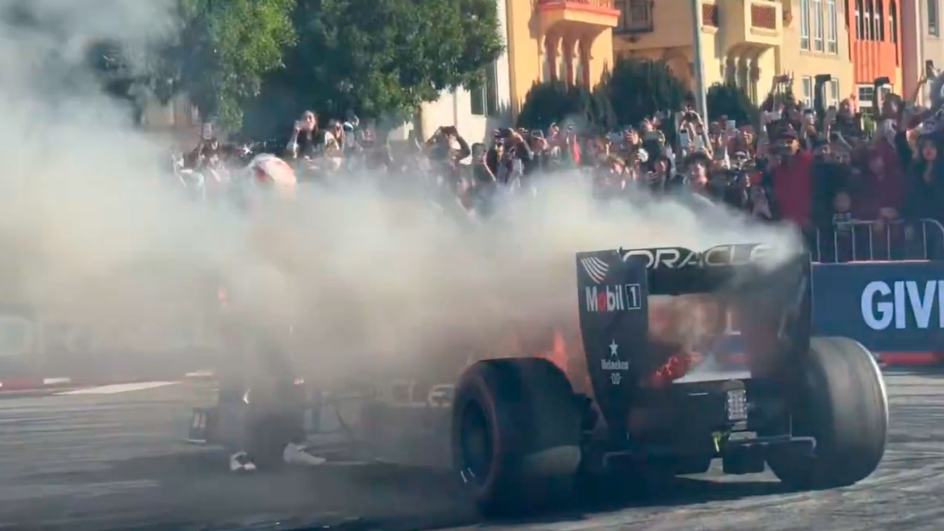Tsunoda se pone a hacer trompos en una exhibición en San Francisco y su Red Bull acaba devorado por el fuego