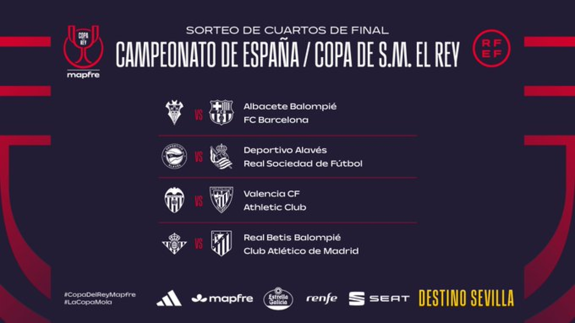 Además, el resto de eliminatorias son Betis - Atlético; Alavés - Real Sociedad y Valencia-Athletic....