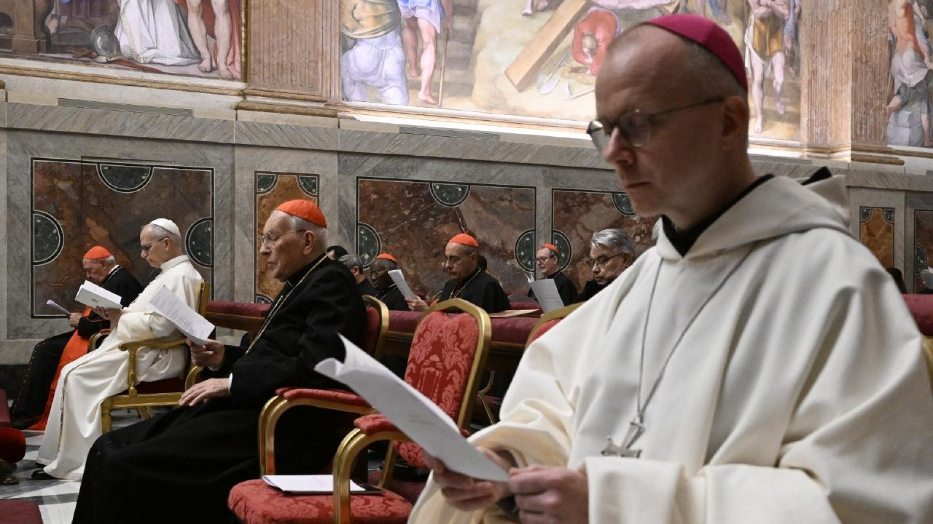 Monseñor Erik Varden, obispo de Trondheim, imparte la primera meditación de la Cuaresma ante el Papa León XIV y la Curia Romana en la Capilla Paulina...