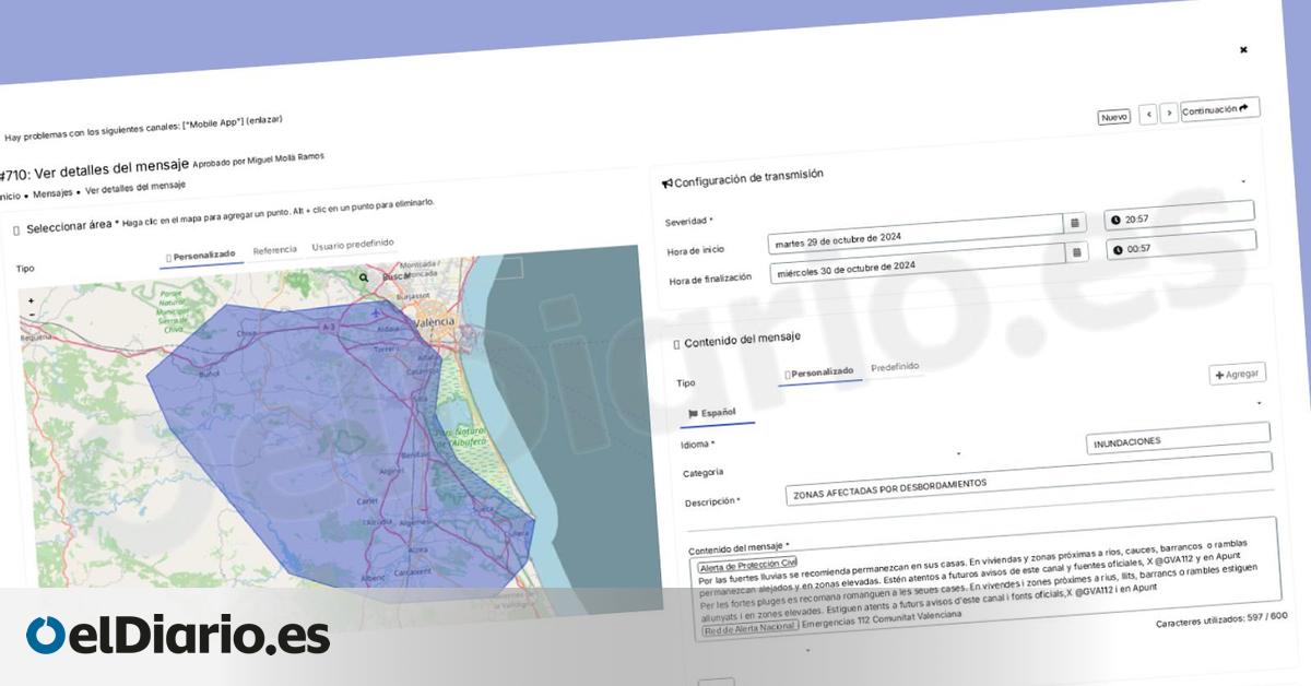 El segundo mensaje a los móviles, enviado a las 20.57, recomendaba a la población: “En viviendas y zonas próximas a ríos, cauces, barrancos o ramblas permanezcan alejados y en zonas elevadas” — La jueza de la DANA tilda de “inútiles” los consejos de Mazón de buscar refugio en altura dos horas despué...