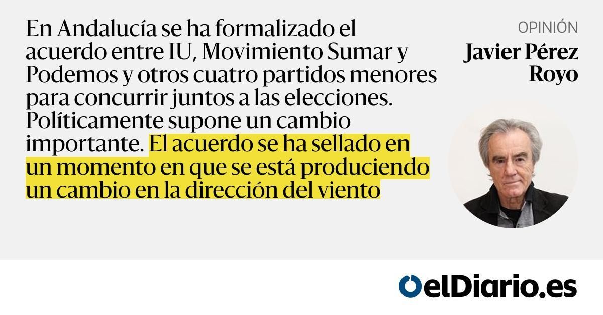 En Andalucía se ha formalizado el acuerdo entre IU, Movimiento Sumar y Podemos y otros cuatro partidos menores para concurrir juntos a las elecciones. Políticamente supone un cambio importante. El acuerdo se ha sellado en un momento en que se está produciendo un cambio en la dirección del viento...