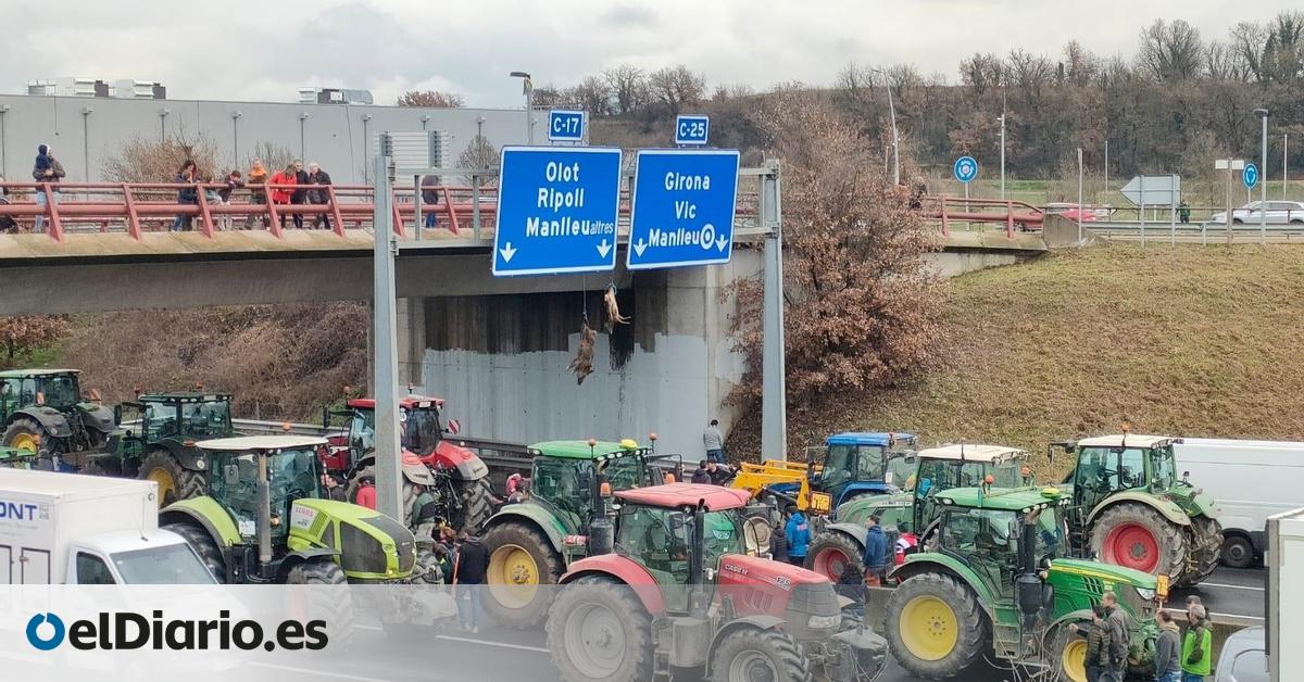 Agricultores catalanes cuelgan un jabalí y un ciervo muertos en la C-17 para protestar por el “exceso” de fauna salvaje