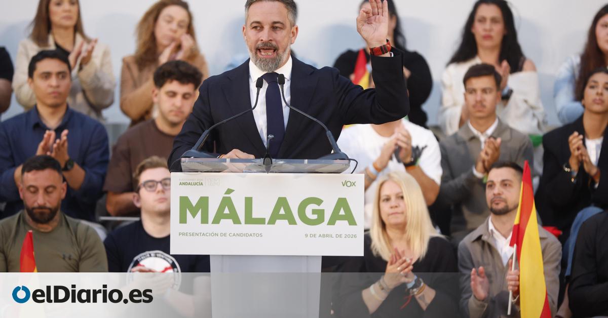 Santiago Abascal presenta al candidato Gavira en un mitin en Málaga, en mitad de las negociaciones en Aragón y Extremadura, que marca la línea que seguirá el partido ultra: culpar a la inmigración del deterioro de los servicios públicos e identificar al PP con el PSOE — Vox no mantiene a ninguna de...