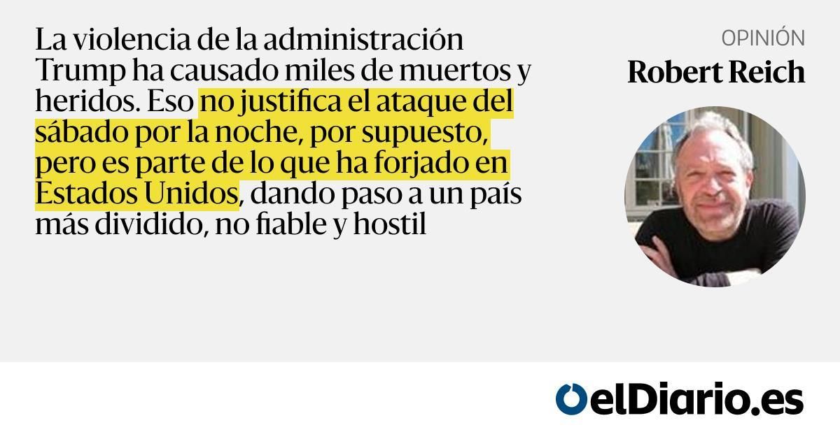 La violencia de la administración Trump ha causado miles de muertos y heridos. Eso no justifica el ataque del sábado por la noche, por supuesto, pero es parte de lo que ha forjado en Estados Unidos, dando paso a un país más dividido, no fiable y hostil...