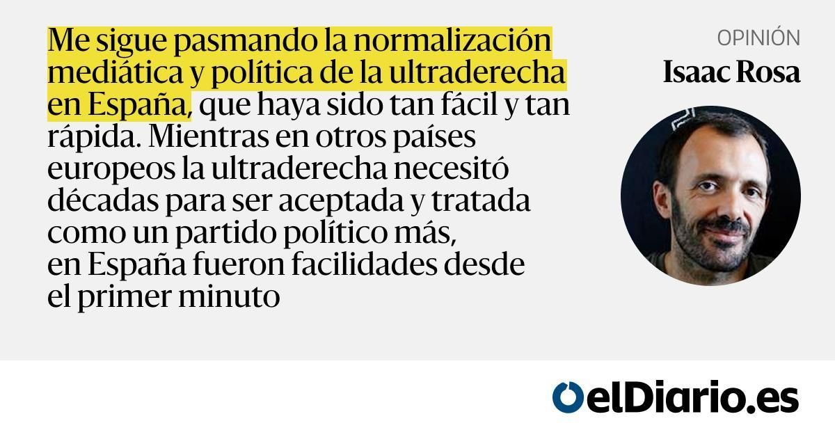 Me sigue pasmando la normalización mediática y política de la ultraderecha en España, que haya sido tan fácil y tan rápida. Mientras en otros países europeos la ultraderecha necesitó décadas para ser aceptada y tratada como un partido político más, en España fueron facilidades desde el primer minuto...