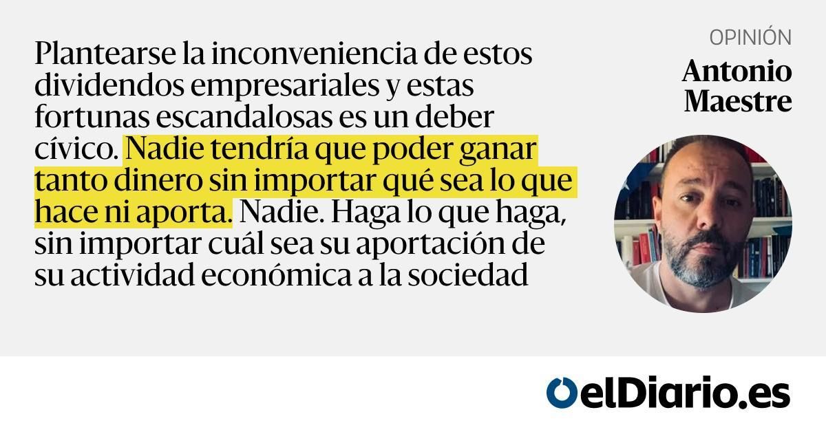 Plantearse la inconveniencia de estos dividendos empresariales y estas fortunas escandalosas es un deber cívico. Nadie tendría que poder ganar tanto dinero sin importar qué sea lo que hace ni aporta. Nadie. Haga lo que haga, sin importar cuál sea su aportación de su actividad económica a la sociedad...