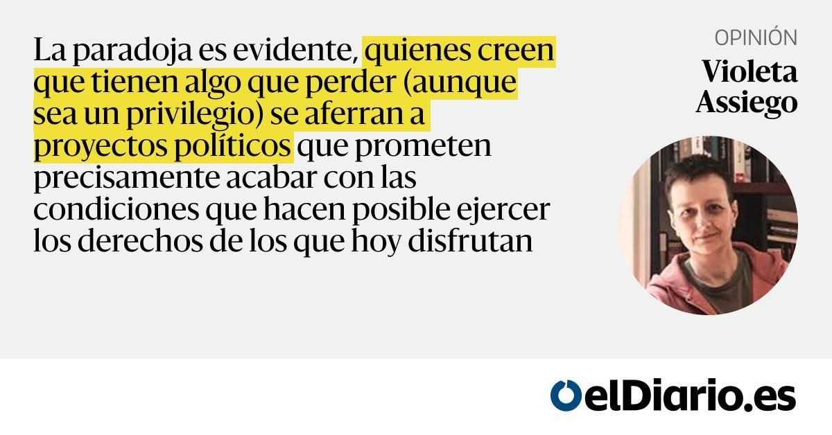 La paradoja es evidente, quienes creen que tienen algo que perder (aunque sea un privilegio) se aferran a proyectos políticos que prometen precisamente acabar con las condiciones que hacen posible ejercer los derechos de los que hoy disfrutan...