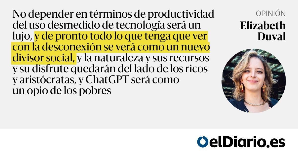No depender en términos de productividad del uso desmedido de tecnología será un lujo, y de pronto todo lo que tenga que ver con la desconexión se verá como un nuevo divisor social, y la naturaleza y sus recursos y su disfrute quedarán del lado de los ricos y aristócratas, y ChatGPT será como un opi...