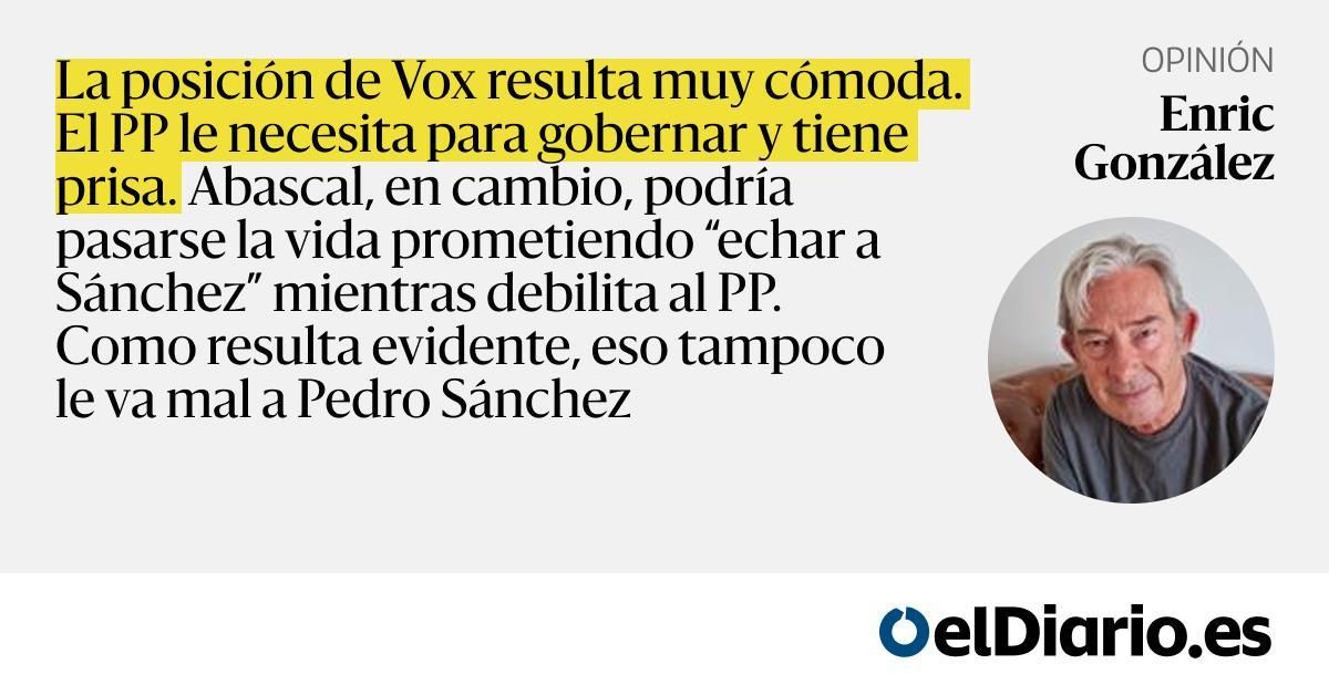 La posición de Vox resulta muy cómoda. El PP le necesita para gobernar y tiene prisa. Abascal, en cambio, podría pasarse la vida prometiendo “echar a Sánchez” mientras debilita al PP. Como resulta evidente, eso tampoco le va mal a Pedro Sánchez...